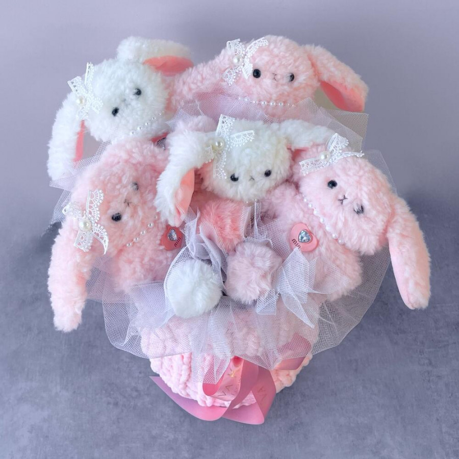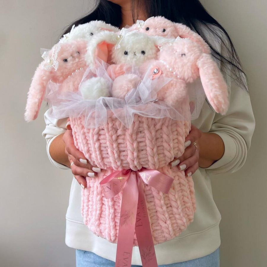 На фото букет из игрушек «плюшевые зайки». В составе: . Все цветы свежие и ароматные, букет красиво оформлен и отлично подходит для подарка. Доступна доставка цветов или самовывоз.