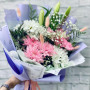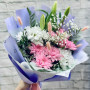 На фото букет из лилий и хризантем. В составе: лилия 2 шт, хризантема кустовая 4 шт, гипсофила 2 шт, папоротник 2 шт, писташ 2 шт, крафт-бумага 1 шт, атласная лента 1 шт, . Все цветы свежие и ароматные, букет красиво оформлен и отлично подходит для подарка. Доступна доставка цветов или самовывоз.