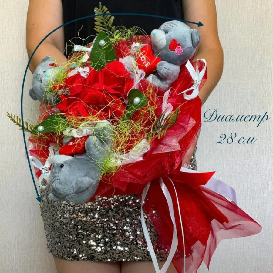 На фото букет из мягких игрушек 3 мишек тедди. В составе: . Все цветы свежие и ароматные, букет красиво оформлен и отлично подходит для подарка. Доступна доставка цветов или самовывоз.
