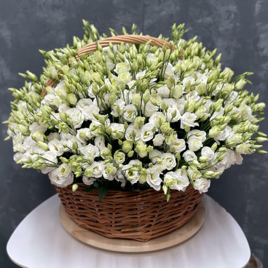 На фото корзина из 101 белой эустомы. В составе: эустома (лизиантус) 101 шт, корзина (xl) 1 шт, . Все цветы свежие и ароматные, букет красиво оформлен и отлично подходит для подарка. Доступна доставка цветов или самовывоз.