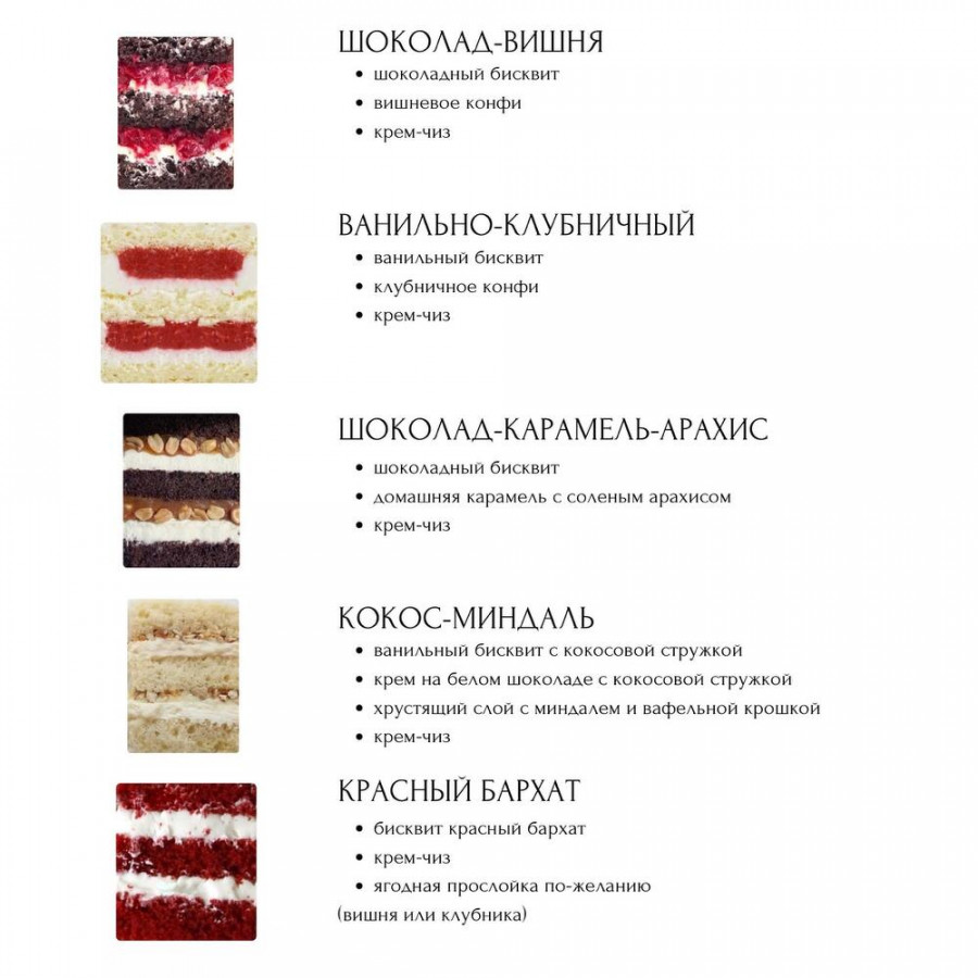 мука пшеничная высшего сорта, сахар, яйцо куриное, какао, растительное масло, разрыхлитель, кефир, краситель красный, сыр 65%, сливки 33%, вишня, крахмал, молоко коровье 2,5%